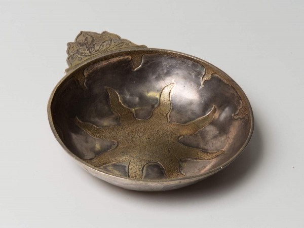 Очевидно, чарка ГРМ также принадлежит к числу произведений, хранившихся в Москве и поступивших в числе посольских даров. Об этом говорит и резной зигзаг на обороте пелюсти — свидетельство определения состава серебра в Москве на рубеже XVII–XVIII веков. (Аналогичная чарка, переданная из ГРМ, находится в Псковском музее-заповеднике.) Пелюсти обеих чарок по форме явно напоминают многолопастные ручки русских чарок, но в отличие от последних имеют изогнутые остроугольные лепестки, похожие на излюбленные мастером языки пламени. На пелюсти Русского музея гравирован рисунок птички, словно присевшей на ветку с еще не сложенным крылом, в естественной, непринужденной позе, типичной и для других голландских серебряных изделий первой трети XVII века (Маркова, 2003. № 9, 10; см. также ил. 192). Характерен для голландского серебра и завиток ветви с мелкими листочками, окружающий птицу. На обороте вдоль венчика клеймо Амстердама и не определенное клеймо мастера. С. М. Новаковская-Бухман // Осень русского Средневековья. СПб, 2018. С. 203.