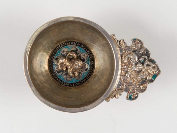 Нарядная золоченая чарка имеет двойное тулово. Ее внутренняя чаша гладкая, кованая, в центре украшена накладной литой мишенью с эмалью и литой фигуркой лежащего на цветочной розетке льва, укрепленного на спине. По ободу мишени на фоне черной эмали пространная нравоучительная надпись: ЧЕЛОВЕЧЕ ЖЕЛАЕШЬ СЛ(А)ВЫ ЗЕМНЫЯ ЗАТО НЕ НАСЛЕДIШЬ НЕБЕСНЫЯ НЕ ЗЛI СМИРИСЯ.