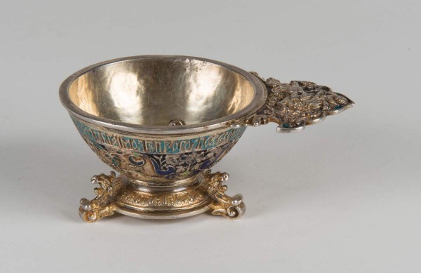 - Серебро, ковка, чеканка, литье, резьба, золочение, эмаль выемчатая. 4 × 6,4 × 9,3