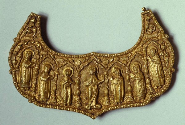 Показать полный текстДве многолопастные цаты (БК-3127, БК-3463) с характерным для XVII века килевидными выступами вверху и внизу украшены искусно чеканенным орнаментом. Особенности узоров говорят о близком времени исполнения, позволяют судить о творческих контактах в Москве ювелиров, происходящих из разных художественных центров.