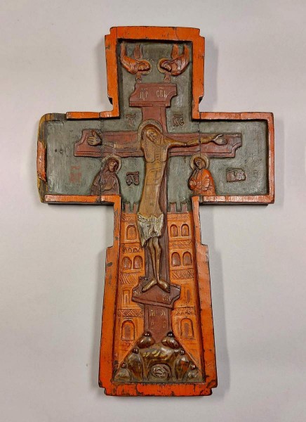 Четырехконечный крест с рельефным изображением Распятия в центре. Фигура Христа сильно вытянута. Под средней перекладиной Голгофского креста резаны полуфигуры Богоматери и Иоанна Богослова (в надписи назван «ИВАНЪ»); вверху — два слетающих ангела; внизу — гора Голгофа с головой Адама. Распятие представлено на фоне высокой иерусалимской стены, украшенной орнаментальными полосами и прорезными оконцами. Ярко-красные бортики-поля подобно ковчегу-реликварию обрамляют этот образ. Крест с изображением Распятия знаменует собой Крестную Жертву и одновременно орудие Спасения. Ольга Клюканова // Иисус Христос. СПб, 2000. С. 265.