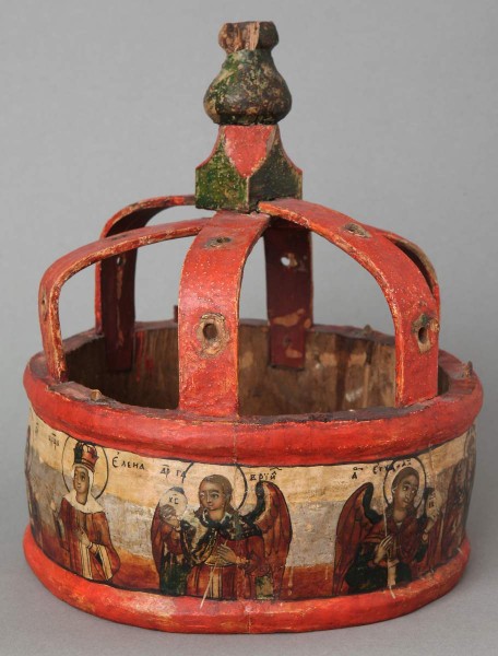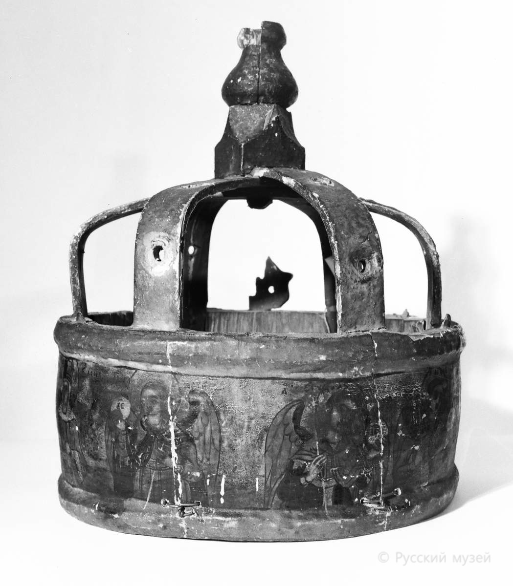 4 сквозные трещины с деформациями на тулове венца; жесткие отслоения и утраты грунта с красочным слоем; плотный слой сгрибившейся и значительно потемневшей олифы.