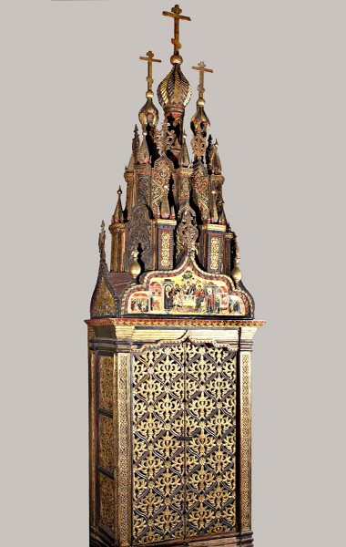 Показать полный текстКиот относится к произведениям малых архитектурных форм, вошедших в широкое употребление в XVI–XVII веках. К их числу принадлежали царские и святительские моленные места, амвоны, надпрестольные сени и киоты, вырезанные из дерева и имевшие богатое декоративное оформление. Достаточно много таких сооружений было создано в Поволжье. Сходство их облика обусловлено воспроизведением реальных форм древнерусского зодчества: шатров, главок, кокошников, арок с гирьками, балясин и т. п. Во многих случаях мастера повторяли и мотивы резьбы, сочетая прорезные детали и причудливые орнаменты по фону, накладные розетки и обрамления в виде перевитого жгута и зубчиков. Параллели рельефной позолоченной резьбе можно найти в чеканных изделиях ярославских серебряников.