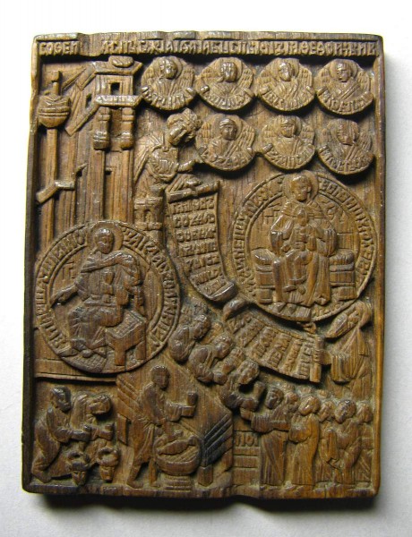 В нижней части иконки изображена сцена, символизирующая трапезу, евхаристию и жертву Христа. По верхнему полю образка обронная (рельефная) надпись: СОФЕИ (Прему) ДР(О)СТЬ Б(О)ЖИА ДАНА БЫСТЬ КН(Я)З(Е)МЬ ФЕДОРОМЪ ИВ...