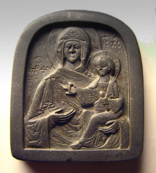 Трапециевидный образок с округленным верхом из темного сланца. В ковчежце – изображение "Богоматери Одигитрии" типа "Смоленской" – фронтально, на левой руке – благословляющий младенец. Надписи резаны вглубь. В отличие от многих других каменных иконок, изображение "Одигитрии" хорошо сохранилось. Оно выполнено тщательно. Прекрасен рисунок. Свободны позы изображенных. В невысоком рельефе разделены планы. Поверхность обработана штриховкой, передающей складки, детали, подчеркивающей объемы. Исследователи древнерусской мелкой пластики предполагают новгородское происхождение этого памятника. Изилла Плешанова // «Пречистому образу Твоему поклоняемся...». Образ Богоматери в произведениях из собрания Русского музея. СПб. 1995. С. 293.