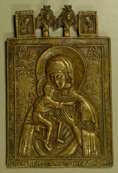Образок имеет навершие, состоящее из двух клейм с изображениями архангелов Михаила и Гавриила и двух прорезных херувимов между ними. Архангелы и высшие ангельские чины поклоняются образу Богоматери, которую прославляли в богослужебных песнопениях как «честнейшую херувим и славнейшую без сравнения серафим, без истления Бога Слова рождшую». Помещение на навершиях образков и крестов изображений прорезных херувимов, или, как их называли в народе, «шестикрыльцев», было отличительной чертой гуслицкого литья, центр которого находился недалеко от Москвы, где особенно чтили образ «Богоматери Федоровской». Празднование ее совершается два раза в год –14/27 марта и 16/29 августа. Татьяна Петренко // «Пречистому образу Твоему поклоняемся...». Образ Богоматери в произведениях из собрания Русского музея. СПб. 1995. С. 320.