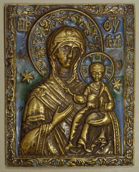 Меднолитая иконка отличается от большинства медных образков высоким рельефом изображения, ясной скульптурностью форм, мастерством отливки. Иконку украшает синяя, голубая и зеленая финифть (цвета Богоматери), создающая сдержанную колористическую гамму. Рамка вокруг средника и нимб Богоматери украшены орнаментом из вьющегося стебля с продолговатыми листьями, характерным для многих старообрядческих образков XVIII–XIX вв. Монументальность образа, строгий рисунок силуэта, сдержанное использование орнаментальных мотивов свидетельствуют о преемственности древне-русских традиций в старообрядческой меднолитой пластике, об использовании ими лучших образцов для своих моделей.