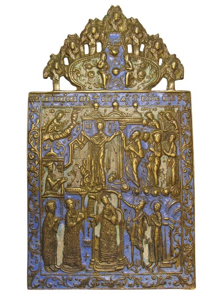 На Руси в 60-х гг. XII в. при владимирском князе Андрее Боголюбском был установлен специальный праздник Покрова, отмечавшийся 1 октября и отразивший константинопольский культ ризы Богоматери. С ним связывались идеи покровительства, заступничества Святой Девы за человеческий род и всю Русскую землю. Существует несколько иконографических вариантов этого сюжета. Ирина Шалина // «Пречистому образу Твоему поклоняемся...». Образ Богоматери в произведениях из собрания Русского музея. СПб. 1995. С. 133.