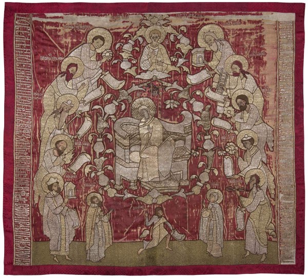 - Атлас, шитье золотными, серебряными и шелковыми нитями. 112,5 х 100