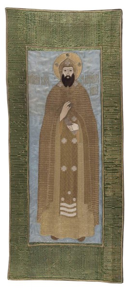- Damask, атлас, pearls, emeralds, шпинели, silver, шитье крученым шелком, золотными и серебряными прядеными нитями. 213 х 92