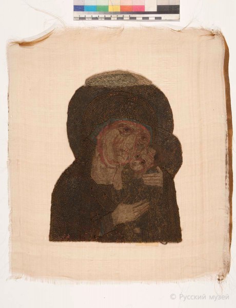 Икона демонтирована со старого фона, удалена поздняя реставрационная вставка, восполнены утраты нити прикрепы; памятник переложен на новый фон, отсутствующая часть нимба Богоматери обозначена на фоне петельчатым швом шелковой нитью, подведен новый подклад. Все детали экспоната укреплялись и монтировались иглой и шелковой нитью.