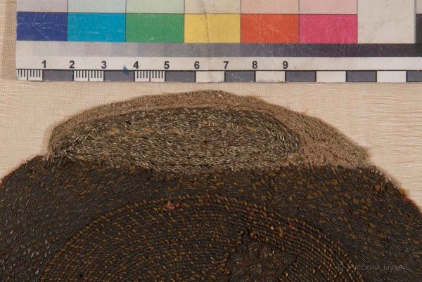 Укреплены отстающие золотные нити вышивки, обтрепанные нити шелка укреплены по контуру.