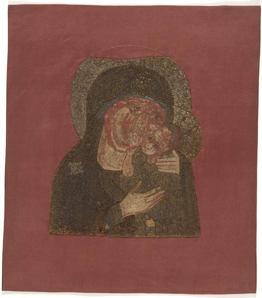 Изображение Богоматери вышито по малиновой шелковой ткани. Фон сохранился только под вышивкой – шелк обрезан по контуру вышивки. Нити шелка во многих местах осыпались. Золотные нити вышивки потемнели, потерты, местами сломаны, утрачены; нити прикрепы имеют обрывы, сечения. Шелковые нити лицевого шитья ветхие, потемнели, имеют множественные утраты. Верхняя часть нимба Богоматери имеет значительную утрату, которая восполнена грубым серебряным шнуром, нашитым рядами на холст. Памятник нашит по контуру на тонированный тонкий шелковый газ. Газ неравномерно выцвел, края обтрепаны. Общее сильное загрязнение, пятна воска по всей поверхности вышивки. На тыльной стороне на холсте остатки старого клея, имеется бумажная наклейка со старым инвентарным номером.
