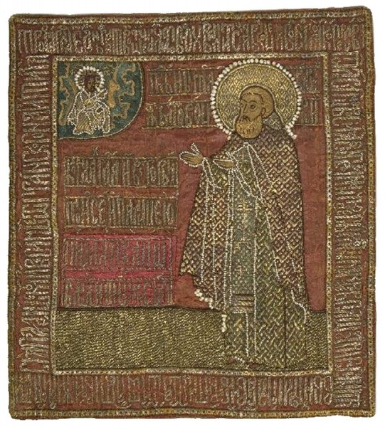 - Камка, шелковая ткань, атлас, шелковые, золотные и серебряные нити, жемчуг. 25 × 22,8