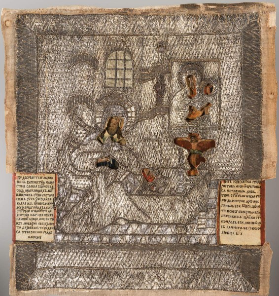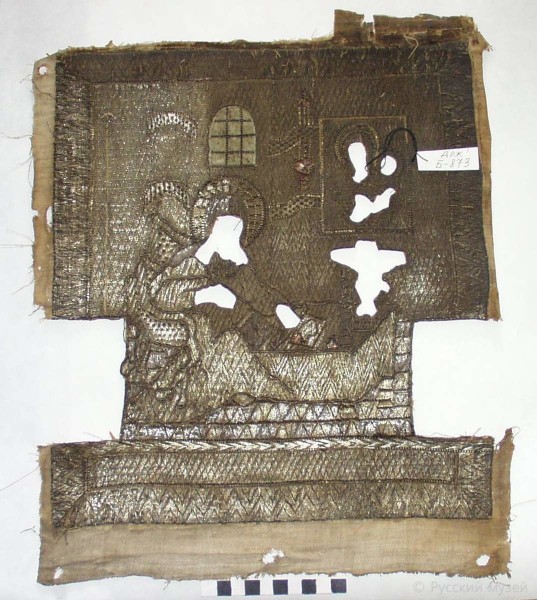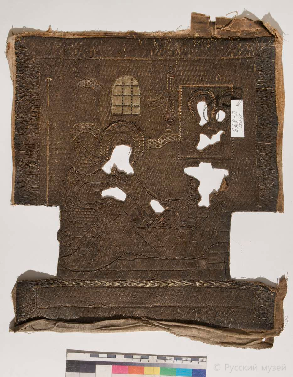 Шелковой нитью, по тону близкой к первоначальной, укреплена оборванная прикрепа золотного шитья. Фрагменты холста и шелка по верхнему и нижнему краям дублированы иглой по контуру на подложенный холст х/б нитью. Также укреплены утраты (предположительно от гвоздей). Устранена деформация.