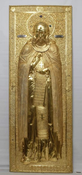 Преподобный Александр изображен в рост, с благословляющей десницей и развернутым свитком с текстом наставления братии. Он представлен старцем, облик которого наделен чертами строгого и взыскательного пастыря. Скульптурный образ святого создан в высоком рельефе. Мастерство серебряников проявилось в умении выявить объем скрытого под облачениями тела и придать фигуре вполне ощутимое движение. Наиболее объемно выполнена голова святого. Фигура в целом трактована более плоскостно, ее рельеф плавно понижается к ногам. Тот же прием применен в декоре фона — высота чеканных деталей орнамента в верхней части крышки раки становится выше, а сами детали крупнее. Венец, фон и поля покрыты узором «трав золоченых», побеги, трилистники, цветки и шишки которых варьируются на разных участках оклада. Чеканщики демонстрируют не только владение различными техническими приемами — чеканкой, гравировкой, резьбой, литьем, но и удивительно тонкое и продуманное их использование. Чеканы с различными профилями для канфарения фонов орнаментов и на мантии позволили воспроизвести в серебре фактуру различных материалов. На полях в круглых медальонах помещены изображения святых, соименных членам царской семьи, — преподобного Михаила Малеина, святого Алексея, человека Божия, преподобной Евдокии, мучениц Анны, Ирины и Татьяны. Нимб святого на верхнем поле венчает образ Святой Троицы.