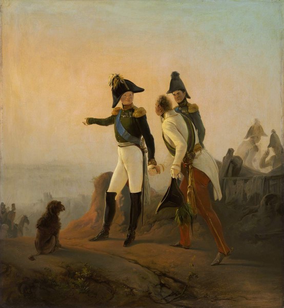 The people and the panorama of the city in the distance depicted in the painting fairly accurately show the events related to March 1814: Emperor Alexander I convinced Austrian Field Marshal Karl Schwarzenberg to move the allied troops to Paris. Near the emperor stands Prince Pyotr Volkonsky, the Chief of the General Staff of the Russian troops, who is believed to have suggested taking Paris rather than pursuing Napoleon across France. The stylistic characteristics of the work, as well as the initials “G.W.”, allow us to suggest that the artist of the canvas is the battle painter Gottfried (Bogdan) Willewalde, who did paintings on the subject of the Napoleonic Wars, among others.