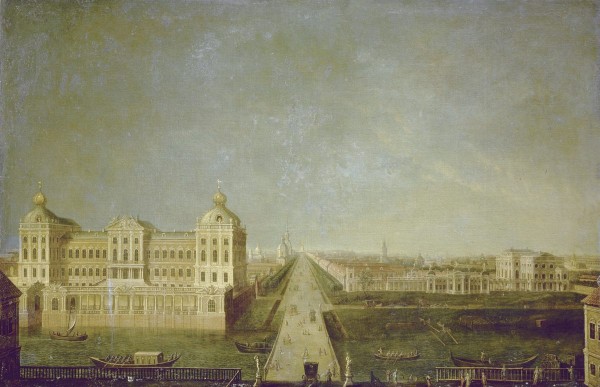 Исполнен по видоизмененной гравюре Я. В. Васильева (1750–1751; Гр.-3025) с рисунка М. И. Махаева (1749–1750) «Проспект новопостроенных палат против Аничковских ворот от восточной стороны с частью. Санкт-Петербурга и Невской перспективной. дороги от реки Фонтанки». В 1753–1755 на участке между Итальянской улицей, Невским проспектом и Фонтанкой архитектором С.И. Чевакинским был построен для И. И. Шувалова: дворец со служебными флигелями и садом, изображение которого видно справа. Слева — Аничков дворец. Елена Столбова // Санкт-Петербург: Портрет города и горожан. СПб, 2003. С. 27.