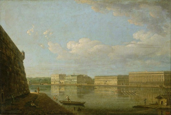 This is a repeat version of a painting for which Fyodor Alexeyev was elected to the Imperial Academy of Arts – View of Palace Embankment from the Peter and Paul Fortress (1794, Tret. Gal.). On the left is the Peter and Paul Fortress with the Naryshkin Bastion. The Naryshkin Bastion was renamed the Catherine Bastion after the wife of Peter the Great (1725). The Summer Garden can be seen on the opposite bank of the River Neva. Palace Embankment begins on the right with the Marble Palace and the Betskoi and Saltykov houses.