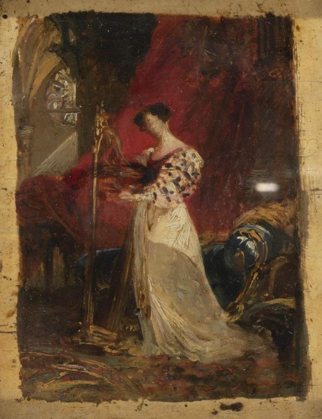 На обороте этикетка с печатным и рукописным текстом: № 93 Художественный Отдел Русского музея. 1928 Принято от Мельницкого адрес Гагаринская, 14, кв. 21. Название худож. Произведения. прип. (зачеркнуто) Брюллову К. Дама с арфой эскиз М. К. Цѣна 40. По заявлению.