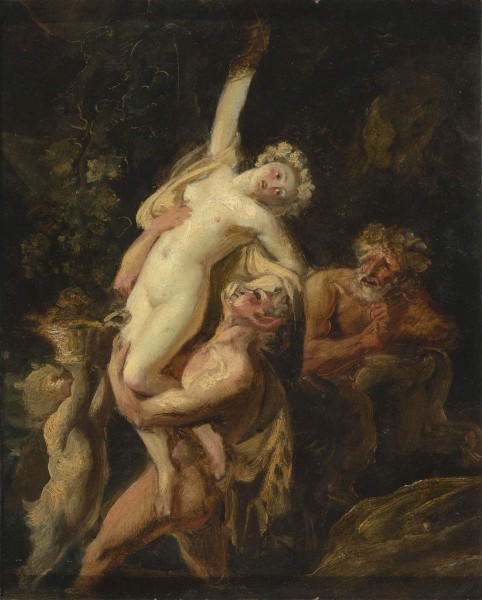 Местонахождение этого эскиза к картине «Вакханалия», задуманной Брюлловым в 1824 году, долго считалось неизвестным, однако описание, приведенное самим художником в письме ОПХ от 28 июня 1824 (Архив Брюлловых 1900. С. 60), позволило отождествить его с картиной из собрания ГРМ, поступившей в музей как «Сатир и вакханка».