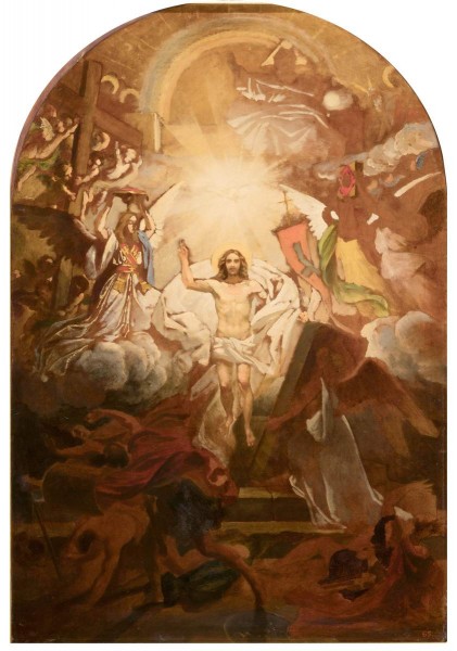 Эскиз к картине — в отделе рисунка ГРМ (Р-146). Традиционное для нового времени изображение Воскресения: вокруг Христа, поднимающегося из гроба, — ангелы с атрибутами страданий. Григорий Голдовский // Иисус Христос. СПб, 2000. С. 336.