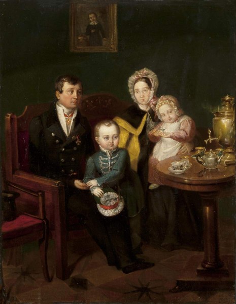 В XIX веке происходит становление своеобразного жанра «в комнатах», к которому можно применить заимствованную в названии фильма Висконти формулу «семейный портрет в интерьере». В этих сценах тихого семейного времяпрепровождения сюжетом является простое пребывание вместе в родных стенах. Люди пьют чай, музицируют, читают, курят трубки, играют за ломберными столиками, тут же присутствуют дети, иногда — собаки. Бесхитростная точность перспективного изображения интерьеров с непринужденно расставленными и рассаженными вдоль стен фигурками, была естественна для современников. Сегодня же, заглядывая сквозь «снятые» стены в дома давно исчезнувших людей, рассматривая их быт, любуясь светом, который столетия назад озарял анфилады просторных комнат, мы слышим «эхо прошедшего времени» и ощущаем магический эффект присутствия в чужой жизни. Как гость, которого «не ждали», мы наблюдаем за таинственной самодостаточностью этих семейных гармоний. Иногда изображенные оборачиваются, будто случайно заметив зрителя, возникает момент контакта, позирования. Любовь Шакирова. Семейный альбом Русского музея // Портрет семьи. СПб, 2014. С. 8.