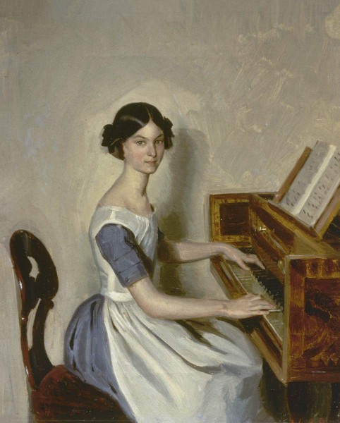 Девушка в синем платье и белом переднике изображена в момент исполнения фортепьянного произведения: чуть удивленно приподняты ее брови, серьезность во взгляде приглушена легкой улыбкой на губах. С помощью определенных композиционных приемов художник позволяет зрителю почувствовать характер и настроение своей модели. Нейтральный фон чуть высветлен вокруг фигуры, создавая ощущение свето-воздушной среды и в то же время акцентируя ее центральное положение на полотне.