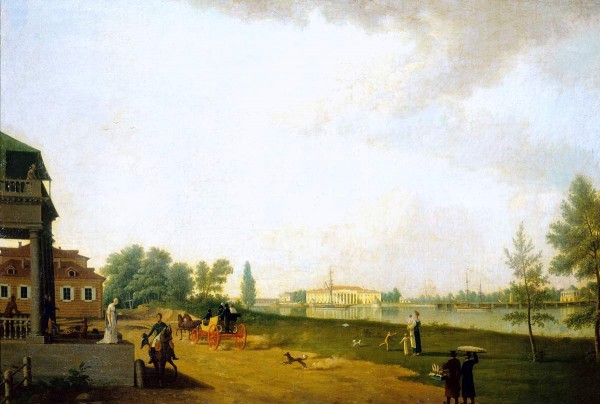 На первом плане – берег Аптекарского острова и загородные дачи конца XVIII века. В центре на втором плане, за Большой Невкой – Каменноостровский дворец (1776–1781, автор неизвестен, строился под наблюдением Ю. М. Фельтена). Справа – дача графа А. С. Строганова. Юрий Епатко // Санкт-Петербург: Портрет города и горожан. СПб, 2003. С. 83.