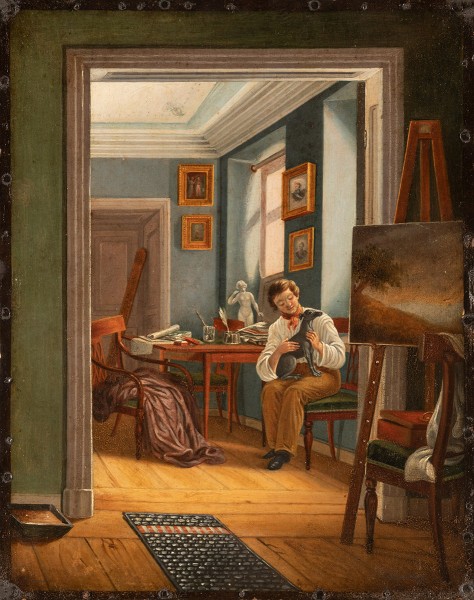 Комната художника; в ней сидящий на стуле человек ласкает собаку