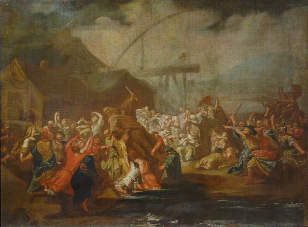Перун — языческий бог-громовержец. Киевский князь Владимир (около 960 — 1015) вначале также поклонялся Перуну. По его приказу в Киеве был воздвигнут кумир с серебряной головой и золотыми усами, а в 980 году такой же идол установлен возле Новгорода. В 988 году князь Владимир принял христианство и приказал истребить языческих идолов. Во время крещения новгородцы вместе с епископом Иоакимом Корсунянином ниспровергли Перуна, выдернули из земли, поволокли к Волхову, при этом секли статую плетьми, и столкнули в реку. Картины военной жизни в отечественном искусстве XVI–XX веков. СПб, 2022. С. 20.