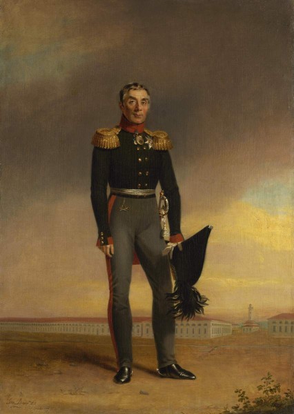 He was made Baron (5 April 1797), Knight of the Order of St Alexander Nevsky (1797), and then Count (5 May 1799). His fall into disgrace took place from 1799 to 1808. Under the reign of Alexander I he became minister and Inspector General of all Infantry and Artillery. In the last decade of his rule Alexander I exerted unlimited influence over every area of Imperial rule. He was the author of the project (making plans, drawings, estimates) for military settlements, and the first barracks which were built on his estate in Gruzino served as a pattern for the building of similar barracks and other structures. From 1819 he was the head of military settlements. Following the accession of Nicholas I he retired and lived in the Gruzino estate, where he was buried in the Cathedral of St Andrew. He appears here in uniform against the background of the barracks of the military settlement in Gruzino. On his epaulettes is the monogram of Alexander I. On the neck ribbon of the Order of St Andrew is a silver medal “In Memory of the Patriotic War of 1812” and a medallion he was granted with a miniature portrait of Alexander I. On his chest is the Order of St Alexander Nevsky (star).