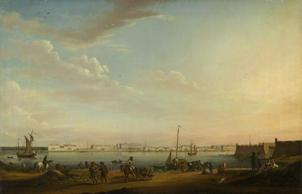 На переднем плане — песчаный берег Петербургской стороны, справа часть стены Петропавловской крепости, на втором плане — Дворцовая набережная от Летнего сада до Старого Эрмитажа (1771–1787, архитектор Ю. М. Фельтен). Елена Столбова // Санкт-Петербург: Портрет города и горожан. СПб, 2003. С. 61.