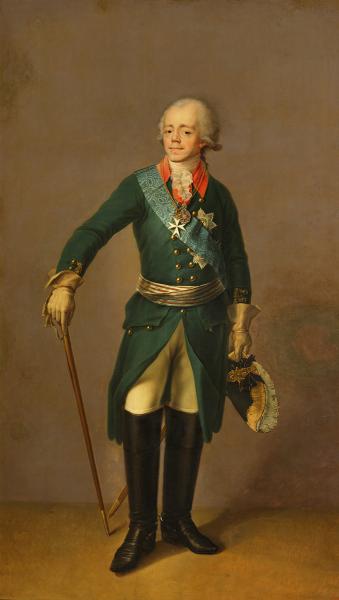 Изображен в мундире лейб-гвардии Преображенского полка, с треуголкой, с орденами св. Андрея Первозванного (лента и звезда), св. Александра Невского (звезда) и св. Анны 1-й степени (крест с бриллиантами). Датируется по оригиналу - Портрет императора Павла I. 1797 (Ж-4699).