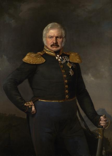 Ермолов Алексей Петрович (1777–1861) — видный государственный и военный деятель, участник антинаполеоновских кампаний 1805, 1806–1807, 1812–1814 годов. С 1816 по 1827 возглавлял военную и гражданскую власть на Кавказе, командовал Отдельным Грузинским (с 1820 — Кавказским) корпусом, управлял гражданской частью в Грузии, Астраханской и Кавказской губерниях, одновременно выполняя обязанности чрезвычайного посла в Тегеране. Был близок к оппозиционным кругам. В 1827 году после суда над декабристами был отстранен от службы и находился в опале. Изображен с орденской звездой, справа орден Георгия и ряд медалей, кресты под короной и типа Мальтийского, на шее орден Владимира.
