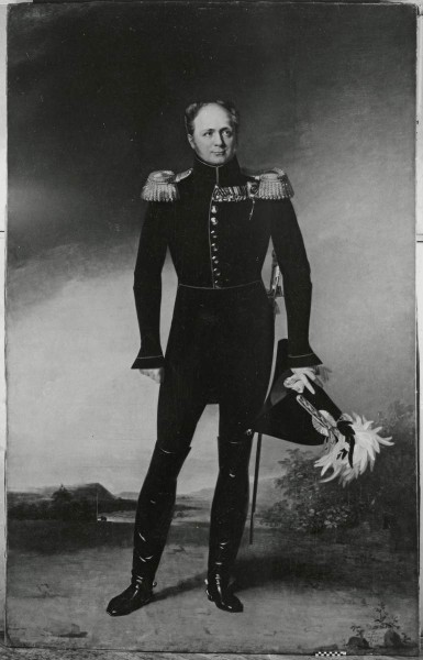 Изображен в вицмундире лейб-гвардии Кавалергардского полка с орденами: Св. Андрея Первозванного (звезда), Подвязки (английский), Меча (шведский). В колодке: крест ордена Св. Георгия 4-й степени, медаль «В память Отечественной войны 1812 года» (серебряная на Андреевской ленте), военный орден Марии Терезии (австрийский), орден Железного Креста (прусский), военный орден Меча (шведский), крест «В память войны 1813-1814 годов» (австрийский) и медаль «В память войны 1813-1814 годов» (прусская).