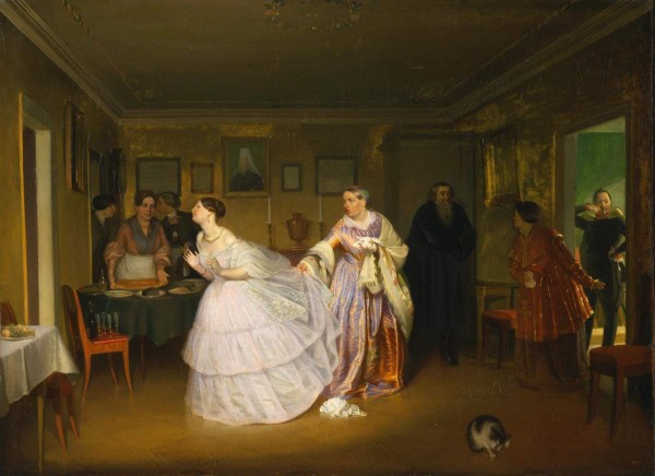 Видимо, в это время бытовому жанру, еще только зародившемуся в России, существенно недоставало умения художников воспроизводить психологические состояния участников событий. Художники той поры больше пользовались «описательностью» в изображении жизненных ситуаций. Евгения Петрова. Рисуночное наследие Павла Федотова на фоне графики 1830—1840-х годов // Павел Федотов. СПб, 2015. С. 20.