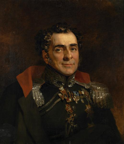 Dmitry Dmitrievich Kuruta (1770–1833), a migrant from Greece, served Russia from 1787. He took part in the campaigns of 1805 and 1806–1807. In 1812 he was made senior Quartermaster of the College of Guards. In 1816 he became lieutenant general, Chief of Staff of the Polish forces, Marshall at the Court of the Grand Duke Konstantin Pavlovich in Warsaw and in 1828 an Infantry general. In 1826 he was elevated to the level of Count. He is depicted here in his quartermaster’s uniform with the Orders of St Alexander Nevsky (star), of St Vladimir of the 2nd class (star and cross on the neck), of St Anne of the 1st class (cross with diamonds), of the White Eagle (star), of Leopold of the 2nd class (Austria, cross), of Maximilian Josef (Bavaria, cross) and the Kulm Cross (Prussia). On the mounting are the Order of St George of the 4th class, the medal “In Memory of the Patriotic War of 1812” (silver, on St Andrew’s ribbon) and the Order of St John of Jerusalem (the Maltese Cross). An identical (unsigned) copy which was completed “before 1825” can be found in the Military Gallery of the Winter Palace.