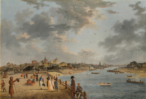 Изображена Москворецкая набережная от Воспитательного дома. За мостом через реку Яузу поднимается высокий холм, носящий название Швивой (или Вшивой) горки, на котором высится великолепный классицистический дворец с бельведером. Построенный в конце 1780-х годов для купца В. В. Суровщикова, в середине 1790-х перешел в собственность Андрея Шапкина, московского купца 1-й гильдии. В 1802 был продан генерал-аншефу Т. И. Тутолмину, который в 1806 году продал усадьбу И. А. Безбородко. Существует предположение, что Л. Н. Толстой изобразил усадьбу в «Войне и мире» как дом графа Безухова.