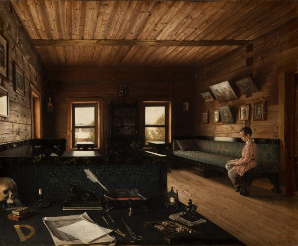 На картине изображен кабинет дома помещиков Милюковых в усадьбе Островки Вышневолоцкого уезда Тверской губернии. Сидящий на диване мальчик — Конон Милюков (1835–1871), третий сын Николая Петровича и Аграфены Кононовны Милюковых (Ж-6441). Возраст мальчика и число «1844», отложенное на конторских счетах, стали основанием для датировки произведения.