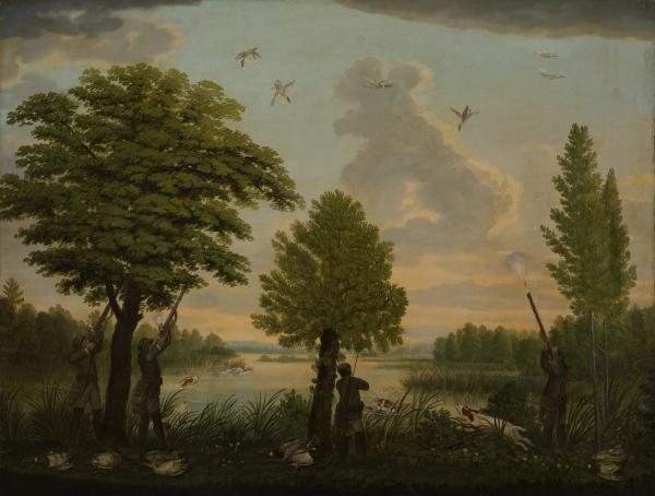 Датирована на основании стилистических и технологических особенностей. Ряд признаков — неточности в рисунке, грубоватая моделировка, «открытые» цвета — свидетельствует о том, что это работа живописца, не получившего профессионального художественного образования. Тем не менее, несмотря на несовершенства техники, автору удалось убедительно передать особый мир, с неповторимой светлой поэтической атмосферой. Подобный лирический настрой, особенно в жанровых картинах, как правило, свойствен работам самоучек, «домашних» художников. Все охотники на картине одеты в костюмы одинакового покроя и расцветки — то есть представляют «охотничью команду» из помещичьей дворни (псари, загонщики и прочие).