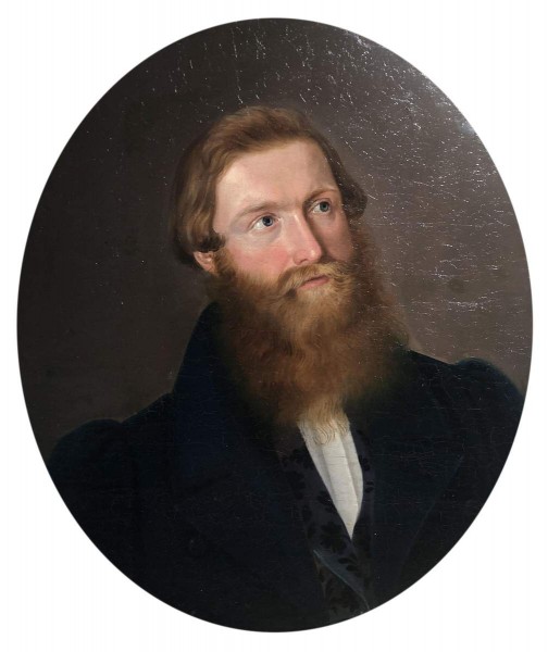 Портрету приданы настоящие размеры и овальная форма в процессе бытования. Стилистика и масштаб изображенной фигуры в портрете разнятся со считающимся парным к нему женским портретом, несомненно, связанным с ним общим источником. Датируется по платью и прическе 1840-ми годами. Светлана Моисеева // Для славы всероссийской! Предприниматели и меценаты в России XVIII – начала XX веков. СПб, 2024. С. 56.