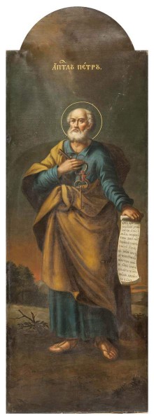 Апостол Пётр (Симон, сын Ионин, 1 до н. э. - около 67, Рим). Один из двенадцати апостолов (ближайших учеников) Иисуса Христа. Вместе с апостолом Павлом называется «первоверховным апостолом». Святой Православной и Католической церквей. В Католической церкви — первый папа римский. Изображается с ключами от рая, стражем которого является, с седыми недлинными волосами и бородой, в жёлто-синем облачении.