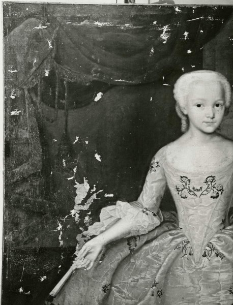 Авторская живопись была покрыта несколькими слоями лака, потемневшими от времени, полностью изменившими и скрывшими оригинальный колорит. Исследования видимой люминесценции поверхности красочного слоя в УФ-лучах показали наличие большого количества записей, расположенных как на лаке, недавних, так и между лаковыми слоями, то есть появившихся давно и в разное время. Записи располагались как на фоне, так и на изображении платья, руки, веера. Разложение (деструкция) лаковых слоев и частично поздних записей проявили сильные цветовые разногласия с авторским слоем. Портрет выглядел темным и бесцветным, неоправданно «пятнистым».