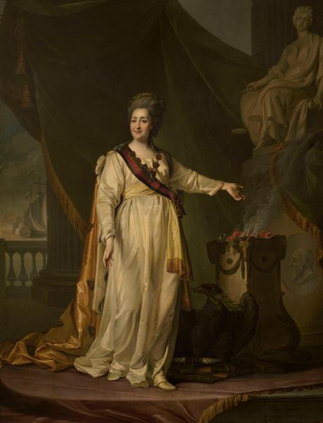 Екатерина II (1729–1796), урожденная София Августа Фредерика, принцесса Ангальт-Цербстская, супруга императора Петра III; стала императрицей в 1762 в результате дворцового переворота. Изображена в мантии с орденами св. Андрея Первозванного (цепь) и св. Владимира 1-й степени (лента и крест). Русский музей. От иконы до современности. СПб. 2015. С. 94.