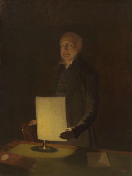 В ряду портретов, написанных П. А. Федотовым, особенно выделяется одна из его поздних работ — изображение Егора Гавриловича Флуга. Художник был хорошо знаком с семейством Флугов, живших неподалеку от него, на 15-й линии Васильевского острова, в собственном деревянном доме с террасой и большим старым садом. Не совсем обычна история создания произведения. Вначале под впечатлением от смерти близкого человека художником был создан рисунок, на котором Флуг был запечатлен на смертном одре («Е. Г. Флуг в гробу», ГРМ). В портрете маслом, написанном на основании рисунка, Федотов заново переживает владевшие им тогда скорбные чувства. Он использует рисунок с его светотеневой моделировкой (источник света — свечи, расположенные по бокам), чтобы воссоздать образ живого, стоящего в рост перед столом Е. Г. Флуга.  На портрете маслом Флуг держит в руках лист бумаги, которым заслоняет яркую свечу. Видимый сквозь бумагу теплый свет смягчает резкость черт лица модели. Сам жест руки Егора Гавриловича как бы отгораживает его от внешнего мира, свет при этом используется, как своеобразный источник духовного напряжения.
