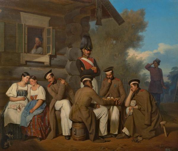 Картина написана Адольфом Иебенсом, родившемся в немецком городе Эльбинг и работавшим в России с 1845 по 1863 годы. Он служил в Петербурге придворным портретистом, а также писал жанровые сцены, преимущественно военной тематики.