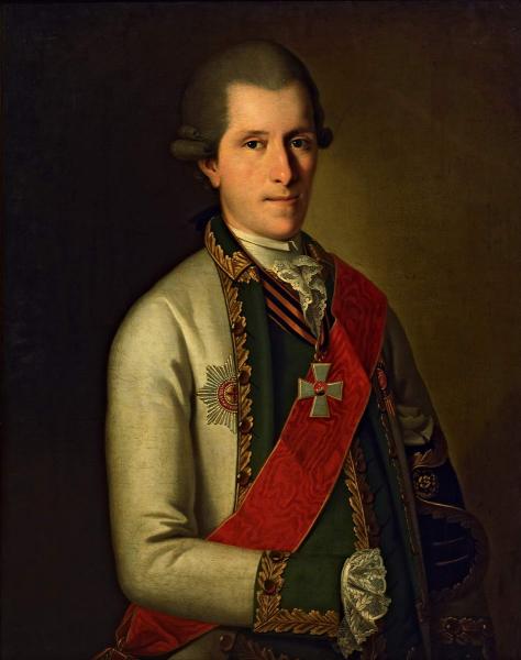 Изображен в мундире вице-адмирала российского флота с орденами св. Анны (лента и звезда; 1774) и св. Георгия 2-й степени (крест и звезда; 1774).