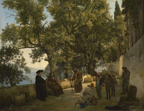 В картине использован мотив «пейзажного интерьера», образованного зеленью деревьев. Особенно охотно Щедрин писал живописных неаполитанских бедняков. Они были естественными обитателями «гаваней» и «террас» и придавали картинам жизненную непринужденность и «местный колорит», которые так ценили романтики. Художник изобразил также монахов и католического священника. Вероятно, о нем Щедрин писал из Сорренто брату в Россию, рассказывая, что священник отказался взять плату за позирование и согласился только отслужить обедню за упокой души его отца. Русский музей. От иконы до современности. СПб. 2015. С. 126.