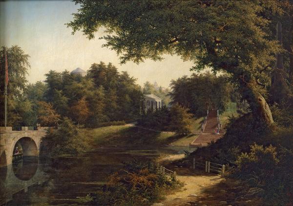 Павловский парк – один и самых живописных парков в окрестностях Петербурга. Его не раз изображали художники на своих полотнах. В картине А. Я. Волоскова, ученика М.Н.Воробьева, запечатлен вид на Большой дворец со стороны реки Славянки и парка Мариенталь. Справа на холме среди деревьев виден обелиск основанию Павловска (проект Ч. Камерона, 1782); на втором плане – Павильон трех граций (проект Ч. Камерона, 1801) с расположенной в центре него мраморной скульптурой "Три грации" Паоло Трискорни. Слева над деревьями виден купол Большого дворца (архитекторы Ч. Камерон, В. Ф. Бренна, А. Н. Воронихин; 1782–1804). Ранее картина приписывалась М. И. Лебедеву, но в 2007 авторство А. Я. Волоскова подтверждено на основании стилистического и технологического исследования, в ходе которых были обнаружены подпись и дата художника на холсте.